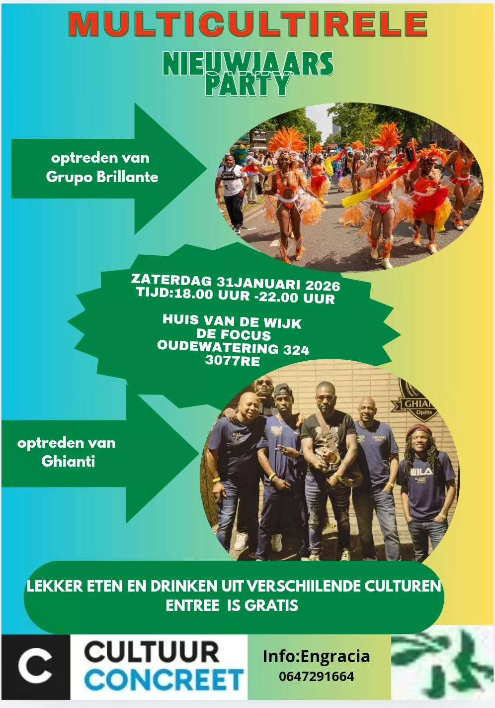 Vier het nieuwe jaar samen met optredens van Grupo Brillante en Ghianti tijdens deze feestelijke avond vol muziek, dans en gezelligheid. Geniet van lekker eten en drinken uit verschillende culturen. Iedereen is welkom!