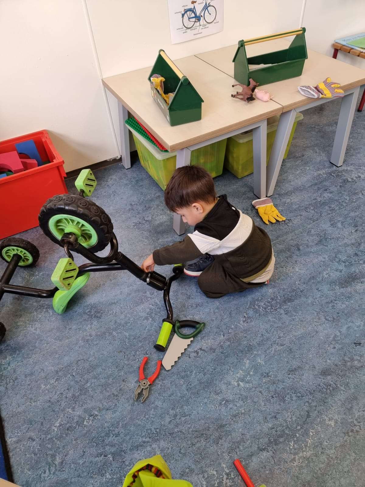 De kinderen van de peuterspeelzaal leren over voertuigen in het verkeer en sleutelen (zogenaamd) eens aan fiets. Wat zit daar nou eigenlijk allemaal op? Ze zijn al hard aan het oefenen.