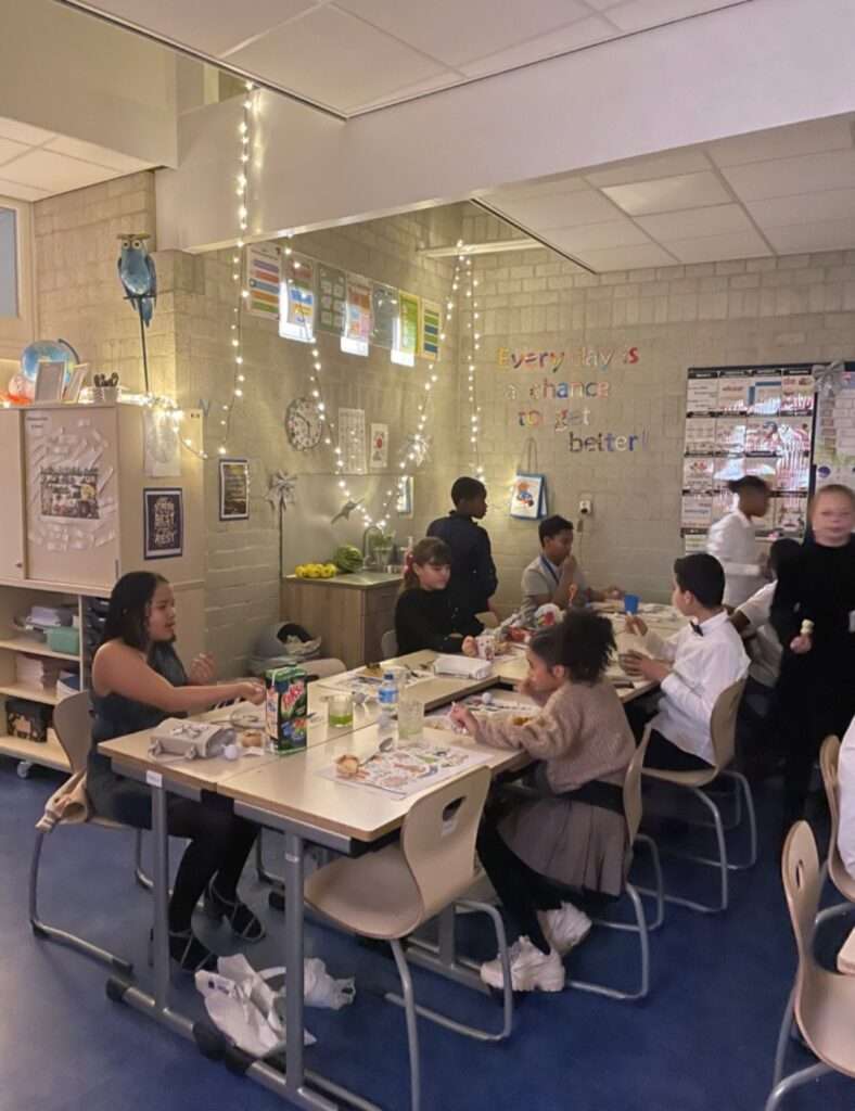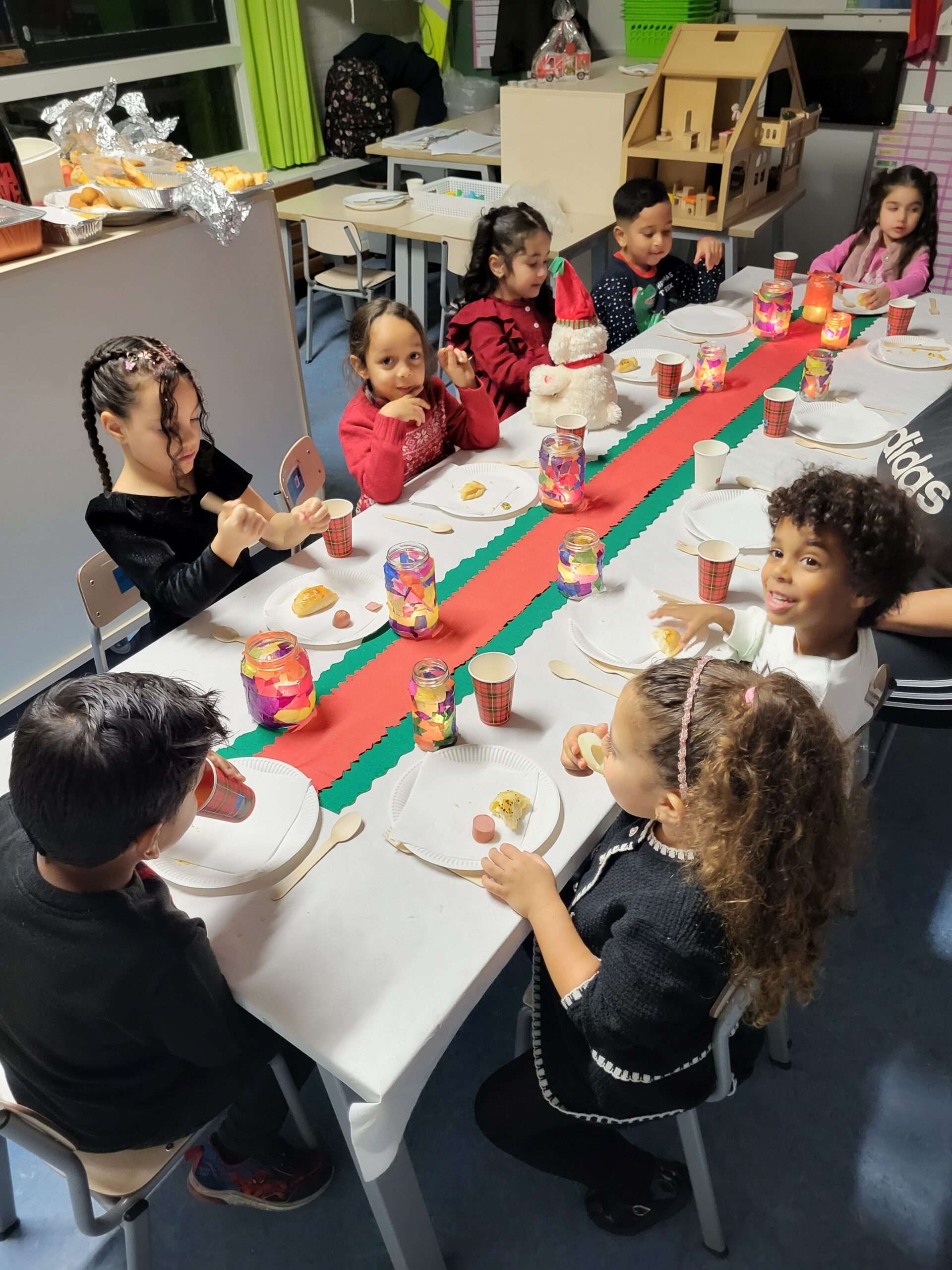 Tijdens het kerstdiner hebben de kinderen, ouders en juffen en meesters zitten smullen van allerlei heerlijke diverse gerechten. Het was een geslaagde avond.