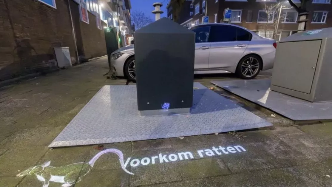 一只老鼠半悬在垃圾箱里,它再用它那光秃秃的尾巴晃了晃,然后滑进了洞里。随后地面上投射出“避免老鼠,将垃圾丢进垃圾箱”的字样。爬进垃圾箱的那只老鼠也是一个视频投影。鹿特丹市政府在城市的4个地点安装了这个视频投影,以引起人们对随地垃圾的关注。画面上可以看到四处游荡的老鼠和文字:“避免老鼠,将垃圾丢进垃圾箱。”