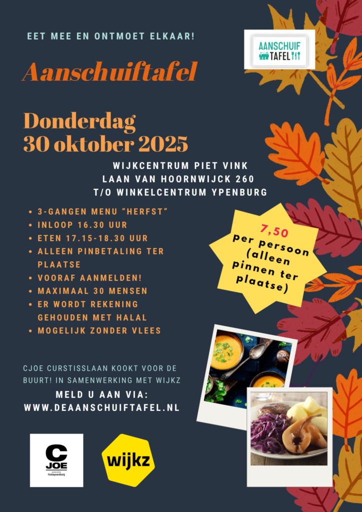 Alle buurtbewoners die daar zin in hebben, kunnen zich aanmelden. Het kost 7,50 per persoon en daarvoor krijg je 3-gangen menu, thema Herfst. Met onder meer pompoensoep en rode kool. Zie de website voor het heerlijke menu, waar je ook kunt aanmelden: https://www.deaanschuiftafel.nl/